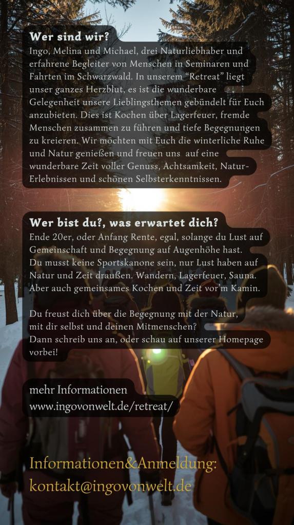 Gemeinschaftliche Naturerfahrung im winterlichen Schwarzwald, gemütliches Kochen überm Lagerfeuer, Sauna, Moonlight-Bogenschießen, inspirierende Coachingsessions zu deinen Zielen 2026 und Abschluss deiner Herausforderungen aus 2025.